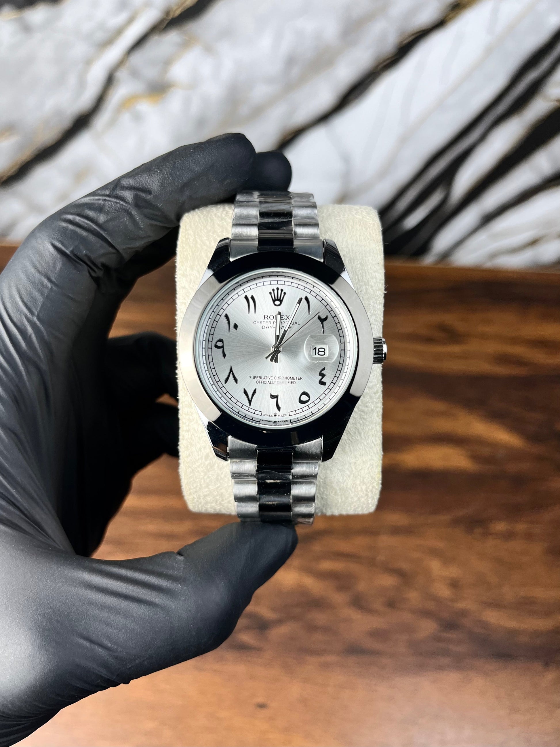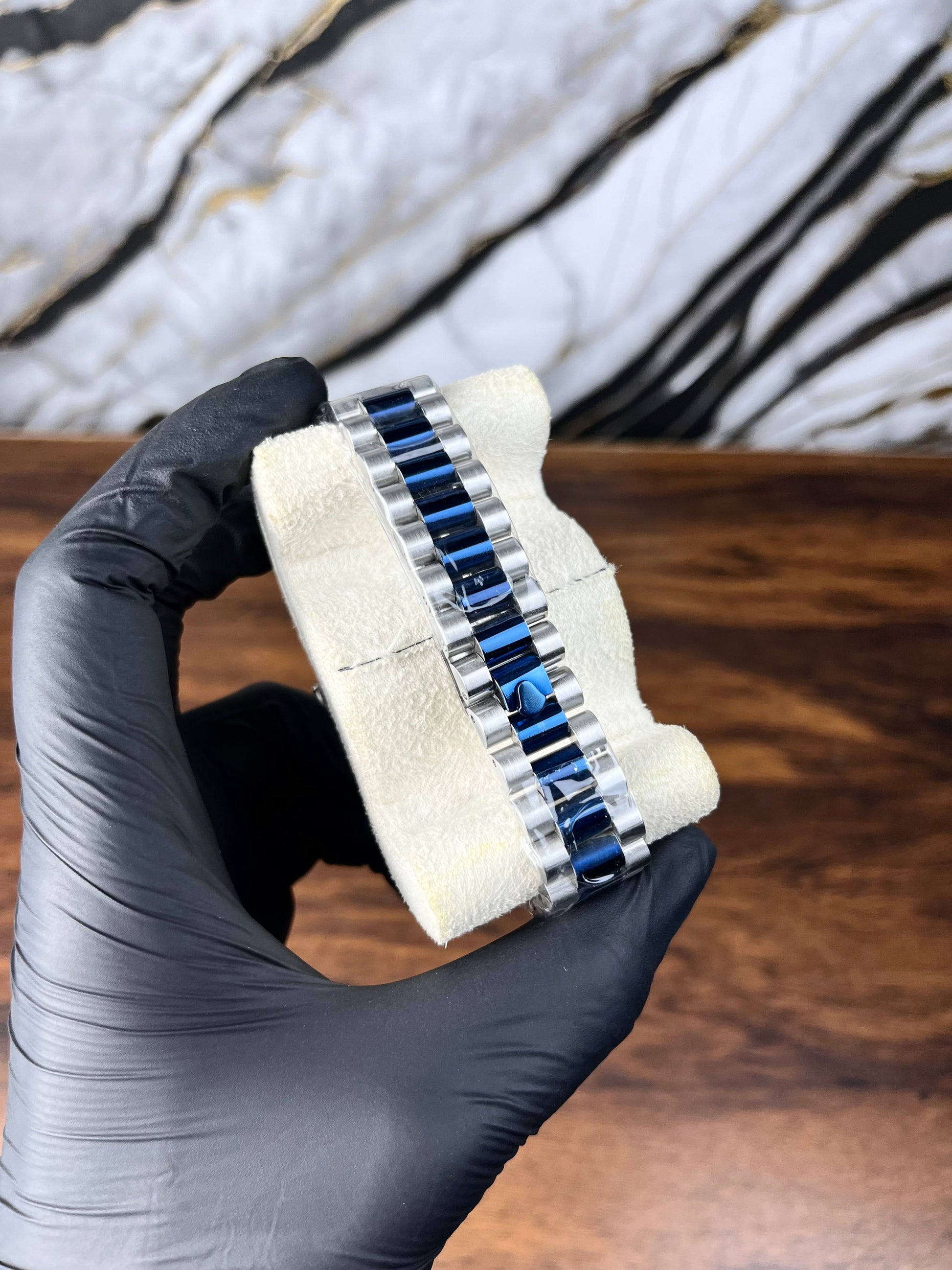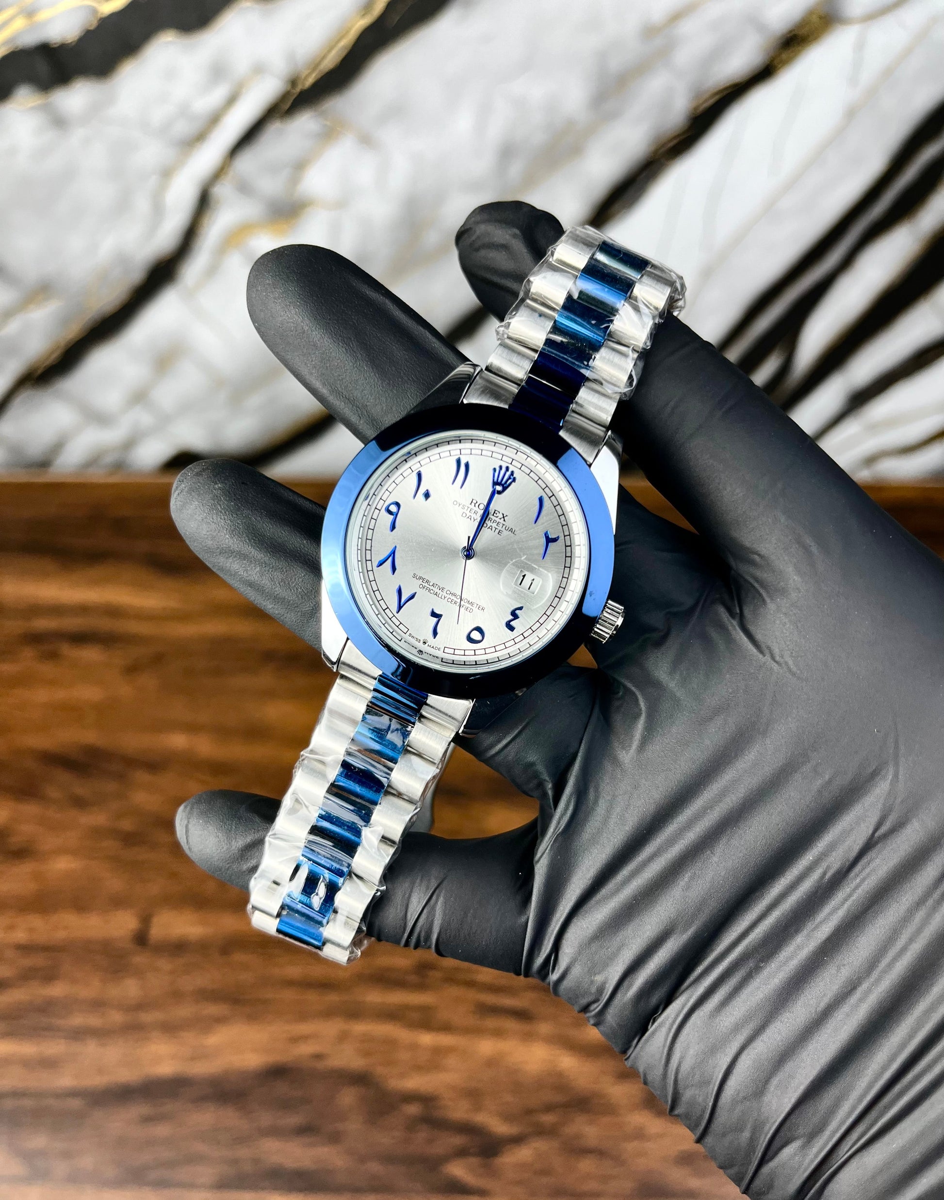 A perfect blend of tradition and style — the RLX Datejust President features a striking two-tone blue and silver finish, Arabic numeral dial, and a classic president-style bracelet for an iconic look.